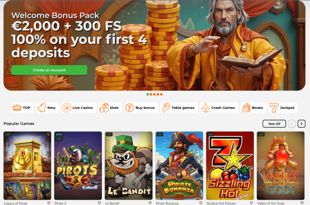 SpellWin is an international online casino brand focused on high-value welcome bonuses and a broad selection of slot titles. The platform features games from well-known software providers, live dealer tables, and multiple deposit options, including traditional banking methods and selected cryptocurrencies.