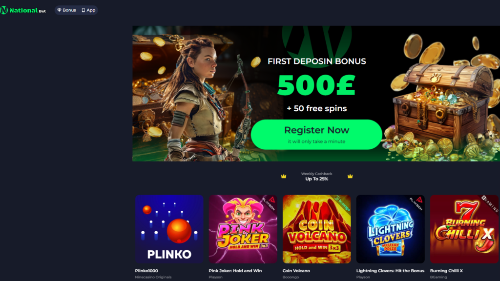 NationalBet is an international online casino and sportsbook platform offering a mix of slot games, live dealer tables, and sports betting markets. The site focuses on providing competitive odds, a diverse casino portfolio, and a user-friendly interface tailored for both desktop and mobile players.